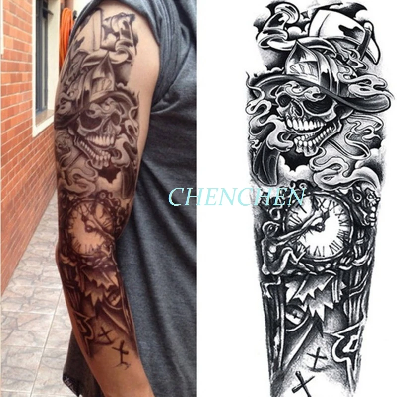 Autocollant De Tatouage Temporaire Bras Plein Grand Taille Diable Crane Horloge Bras De Tatouage De Transfert D Eau Flash Tatoo Faux Tatouages Manches Pour Hommes Aliexpress